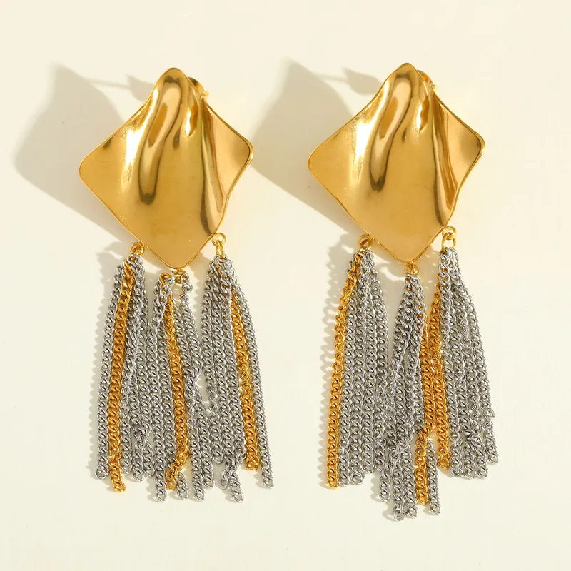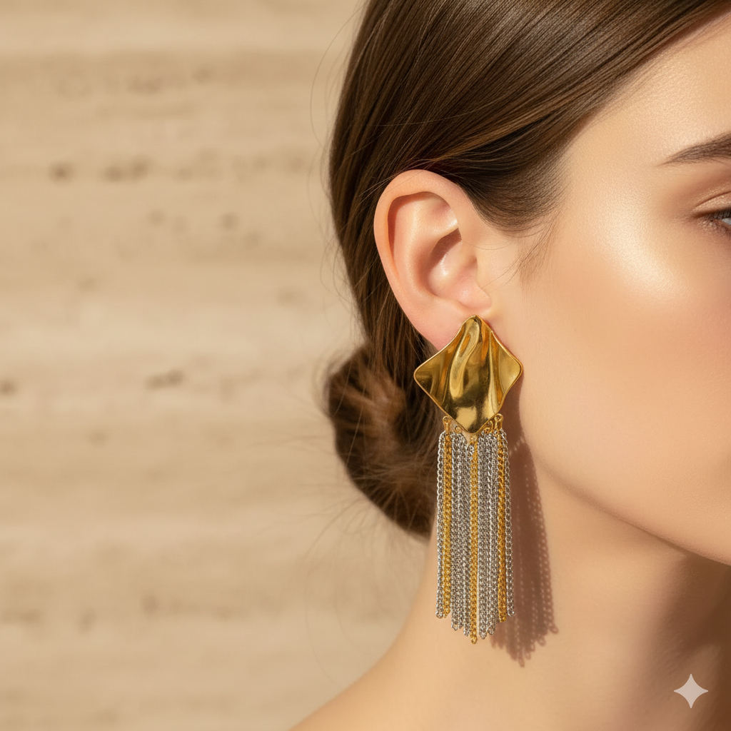 Αποκτήστε μια πολυτελή και εντυπωσιακή εμφάνιση με αυτά τα σκουλαρίκια. Διαθέτουν ένα μοναδικό, ανάγλυφο, χρυσό καρφωτό στο πάνω μέρος και κρεμαστά κρόσσια από αλυσίδες σε χρυσό και ασημί χρώμα, δημιουργώντας μια ξεχωριστή διχρωμία. Ιδανικά για βραδινές εξόδους και ειδικές περιστάσεις.