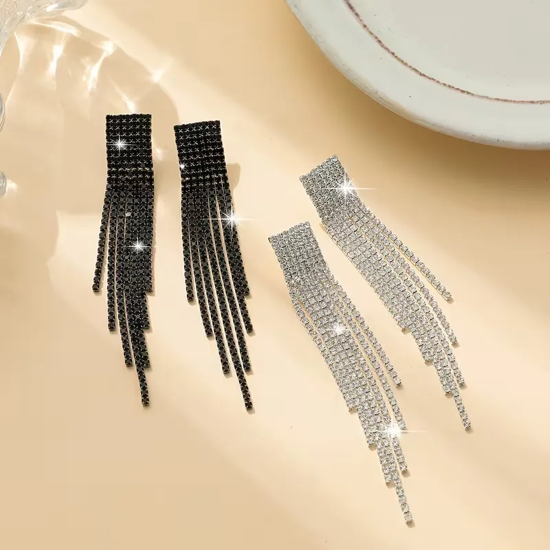 Απογειώστε το στυλ σας με αυτά τα πολυτελή σκουλαρίκια που συνδυάζουν τη διαχρονική λάμψη των στρας με έναν μοντέρνο σχεδιασμό. Διαθέσιμα σε κλασικό ασημί και τολμηρό μαύρο, είναι το ιδανικό γυναικείο κόσμημα για γάμους, πάρτι και επίσημα καλέσματα, προσφέροντας μια μοναδική αίσθηση κίνησης.