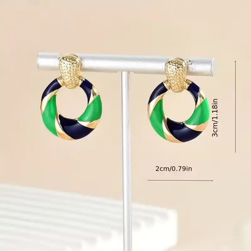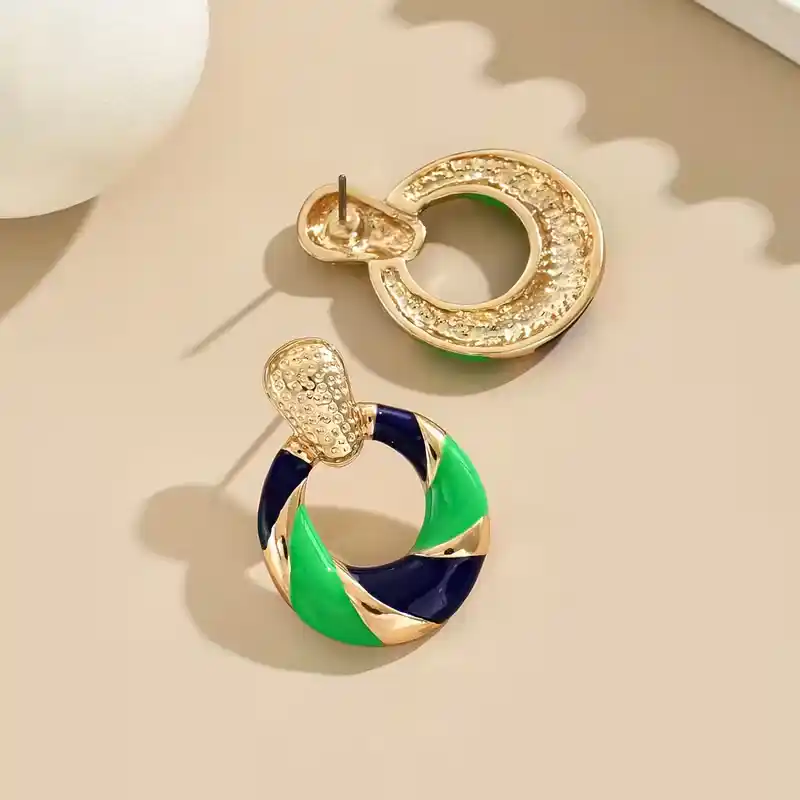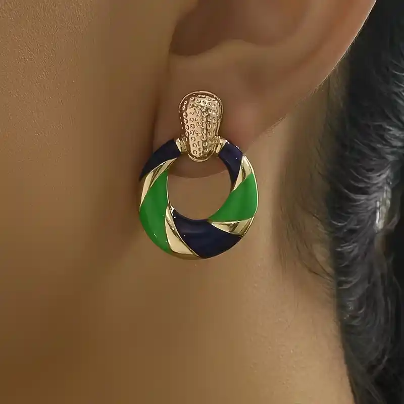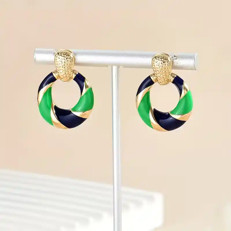 Τα σκουλαρίκια διαθέτουν έναν ιδιαίτερο “στριφτό” σχεδιασμό (twisted design) που εναλλάσσει το χρυσό, το σμαραγδί πράσινο και το navy blue. Η βάση τους έχει ανάγλυφη, σφυρήλατη υφή, προσδίδοντας μια πολυτελή αίσθηση που θυμίζει high-end κοσμήματα.