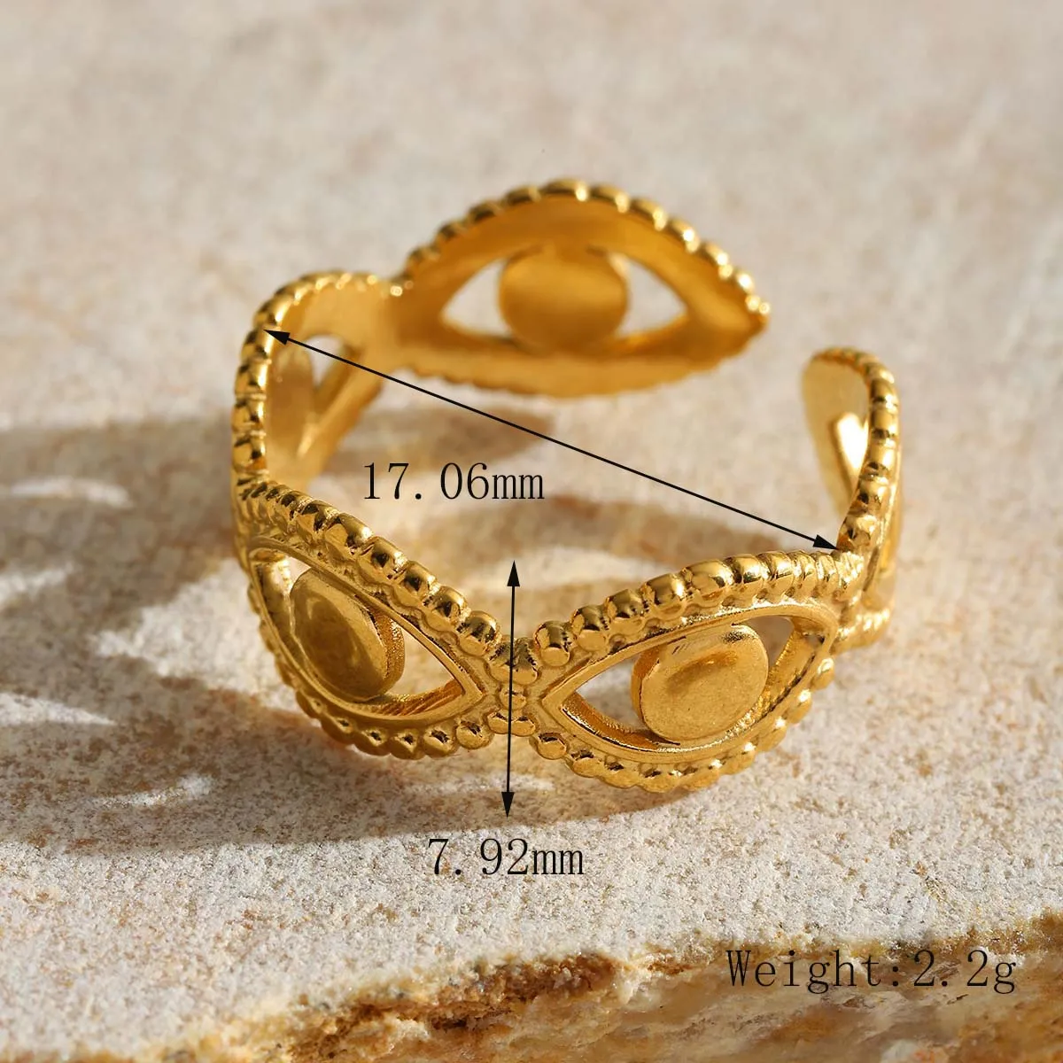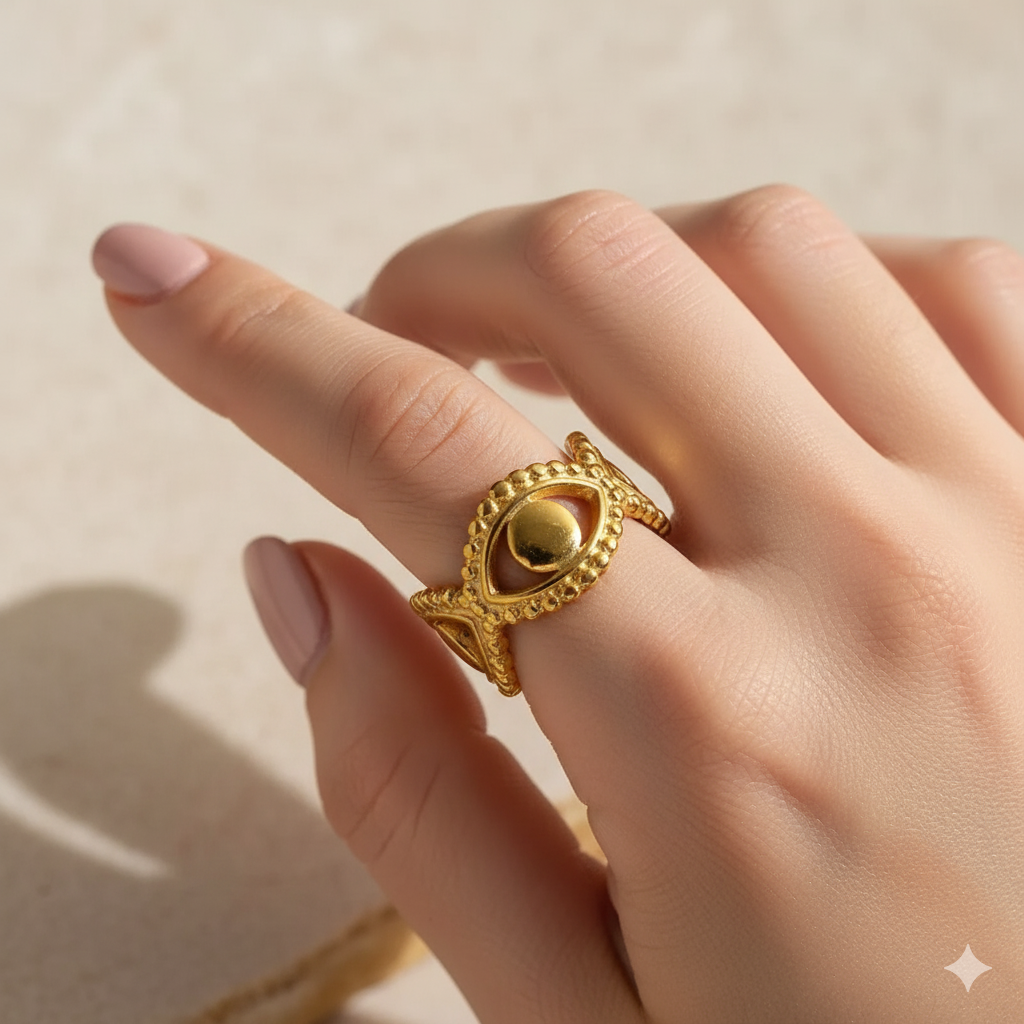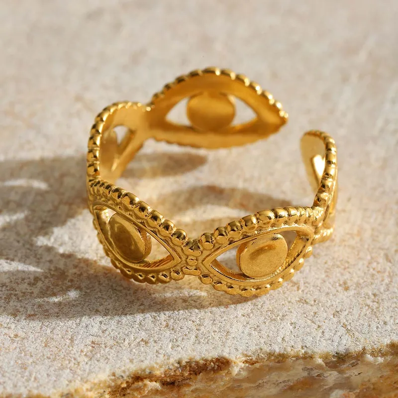 Ένα καλλιτεχνικό, συμβολικό δαχτυλίδι με σχέδιο εμπνευσμένο . Είναι κατασκευασμένο από ανθεκτικό 304 ανοξείδωτο ατσάλι με πλούσια 18Κ επιχρύσωση. Το δαχτυλίδι είναι ανοιχτό (open ring), προσφέροντας ρυθμιζόμενη εφαρμογή. Έχει πλάτος περίπου 7.92mm και είναι εξαιρετικά ελαφρύ, με βάρος μόλις 2.2g. Συνδυάζει μοντέρνο στυλ με παραδοσιακό σύμβολο προστασίας.