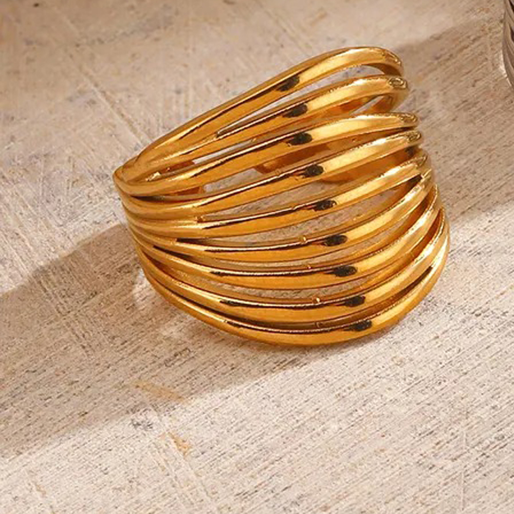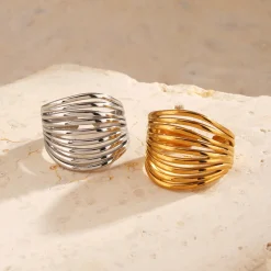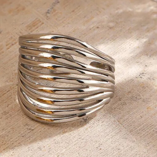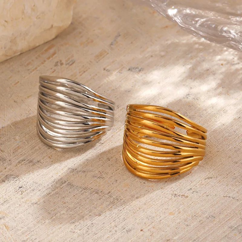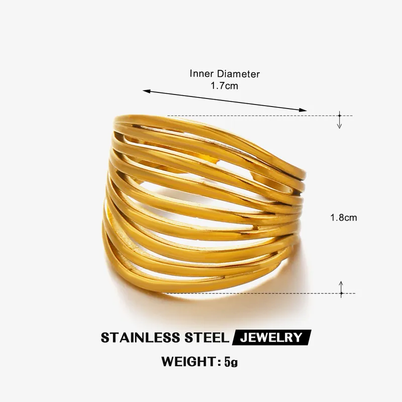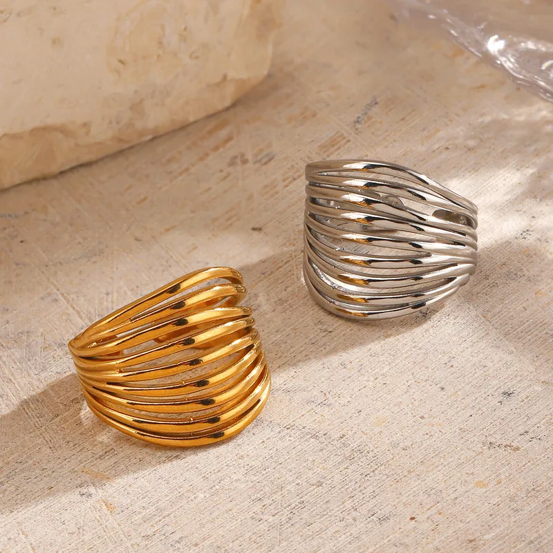 Αναβαθμίστε το στυλ σας με αυτό το μοντέρνο δαχτυλίδι. Διαθέτει ένα εντυπωσιακό πολύγραμμο σχέδιο που αγκαλιάζει το δάχτυλο. Κατασκευασμένο από ανοξείδωτο ατσάλι 304 με επίστρωση 18Κ χρυσού (IP), είναι αδιάβροχο και δεν μαυρίζει, εξασφαλίζοντας λάμψη που διαρκεί. Το ανοιχτό του design το κάνει εύκολα προσαρμόσιμο. Διαθέσιμο σε χρυσό και ασημί χρώμα, για να ταιριάζει σε κάθε σας εμφάνιση.