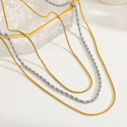 τρία κολιέ σε ζεστό χρυσό τόνο, σχεδιασμένα για να φοριούνται μαζί ή ξεχωριστά, προσφέροντάς σου αμέτρητες επιλογές στυλ. Κάθε κολιέ διαθέτει διαφορετική αλυσίδα – μια λεπτή snake chain, μια κομψή twisted rope chain και μια διακριτική flat chain – δημιουργώντας ένα ενδιαφέρον παιχνίδι υφών και μηκών.