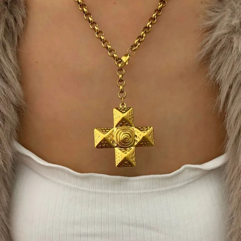Αυτό το εντυπωσιακό κολιέ με σταυρό συνδυάζει την κλασική κομψότητα με έναν μοντέρνο, τολμηρό σχεδιασμό. Είναι κατασκευασμένο από ανοξείδωτο ατσάλι, ένα υλικό που είναι εξαιρετικά ανθεκτικό και υποαλλεργικό. Η επιχρύσωση 18Κ του δίνει μια πλούσια, λαμπερή εμφάνιση που διαρκεί. Ο σταυρός έχει ανάγλυφο μοτίβο και λεπτομέρειες, κάνοντάς τον να ξεχωρίζει. Αυτό το κόσμημα είναι ιδανικό για να φορεθεί τόσο στην καθημερινότητα όσο και σε ειδικές περιστάσεις, προσθέτοντας μια νότα πολυτέλειας και πίστης στο στυλ σας.