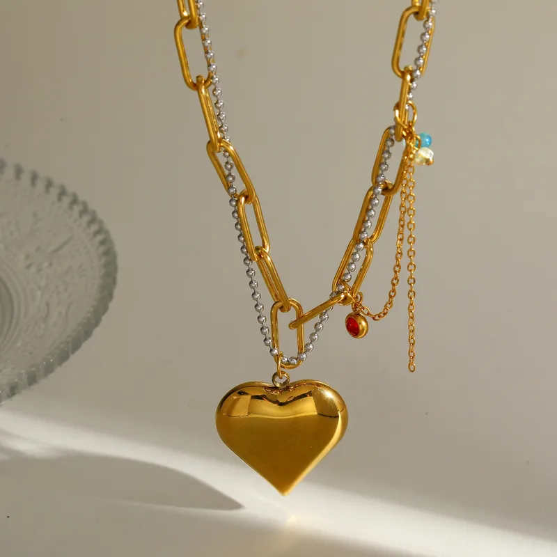 Αποκτήστε ένα κόσμημα που ξεχωρίζει με αυτό το εντυπωσιακό κολιέ. Ο σχεδιασμός του συνδυάζει δύο διαφορετικές αλυσίδες, μια με χοντρούς κρίκους και μια πιο λεπτή με μπίλιες, προσφέροντας ένα μοναδικό και μοντέρνο στυλ. Το μενταγιόν σε σχήμα καρδιάς είναι φτιαγμένο από υψηλής ποιότητας ανοξείδωτο ατσάλι με επιχρύσωση 18Κ, εξασφαλίζοντας αντοχή και λάμψη που διαρκεί. Είναι διαθέσιμο σε δύο αποχρώσεις, χρυσό και ασημί, για να διαλέξετε αυτή που σας ταιριάζει καλύτερα. Ιδανικό για να προσθέσει μια ρομαντική και ταυτόχρονα μοντέρνα πινελιά σε κάθε εμφάνιση.