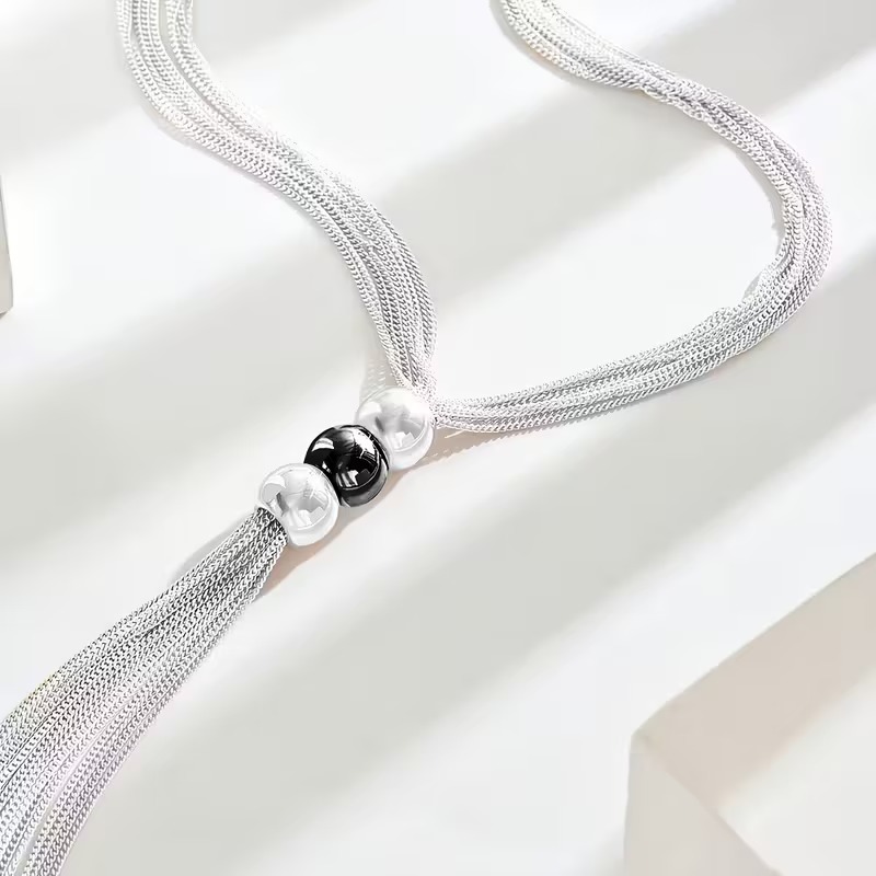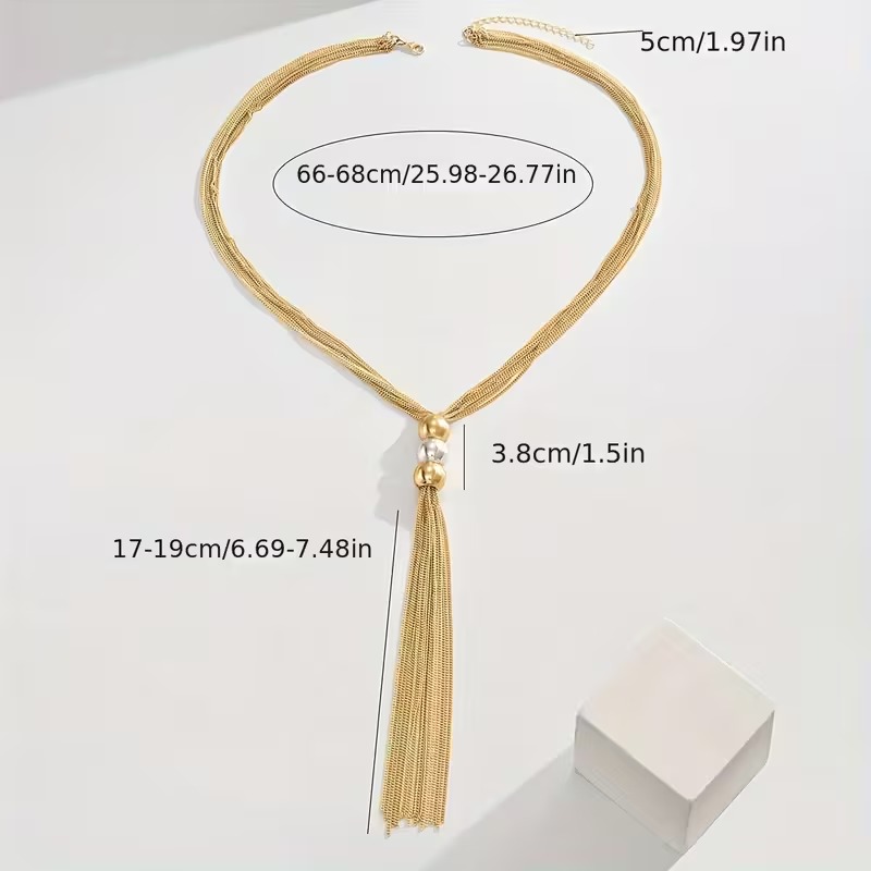 Αποκτήστε αυτό το μοντέρνο και εκλεπτυσμένο κολιέ lariat που θα αναβαθμίσει κάθε σας σύνολο. Το σχέδιο χαρακτηρίζεται από πολλαπλές λεπτές αλυσίδες που σχηματίζουν ένα κομψό V στο ντεκολτέ. Στο κέντρο, δύο ή τρεις χάντρες (μερικές φορές δίχρωμες) συγκρατούν τις αλυσίδες και οδηγούν σε μια πλούσια, μακριά φούντα (tassel) από αλυσίδες, δημιουργώντας μια εντυπωσιακή κρεμαστή εμφάνιση. Διατίθεται σε χρυσό και ασημί τόνο. Με ρυθμιζόμενο μήκος, είναι το ιδανικό κόσμημα για να φορεθεί με φορέματα με χαμηλό ντεκολτέ ή πάνω από πουκάμισα. Ένα must-have αξεσουάρ για γυναίκες που αγαπούν το δυναμικό στυλ.