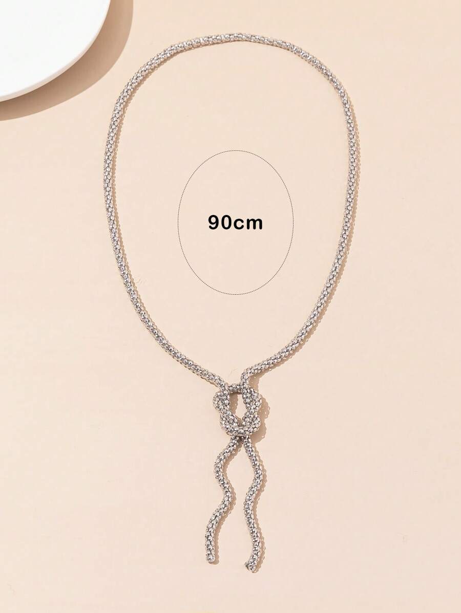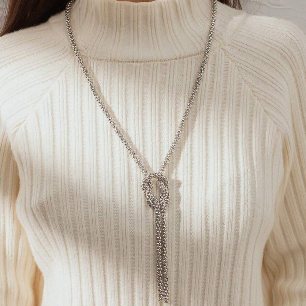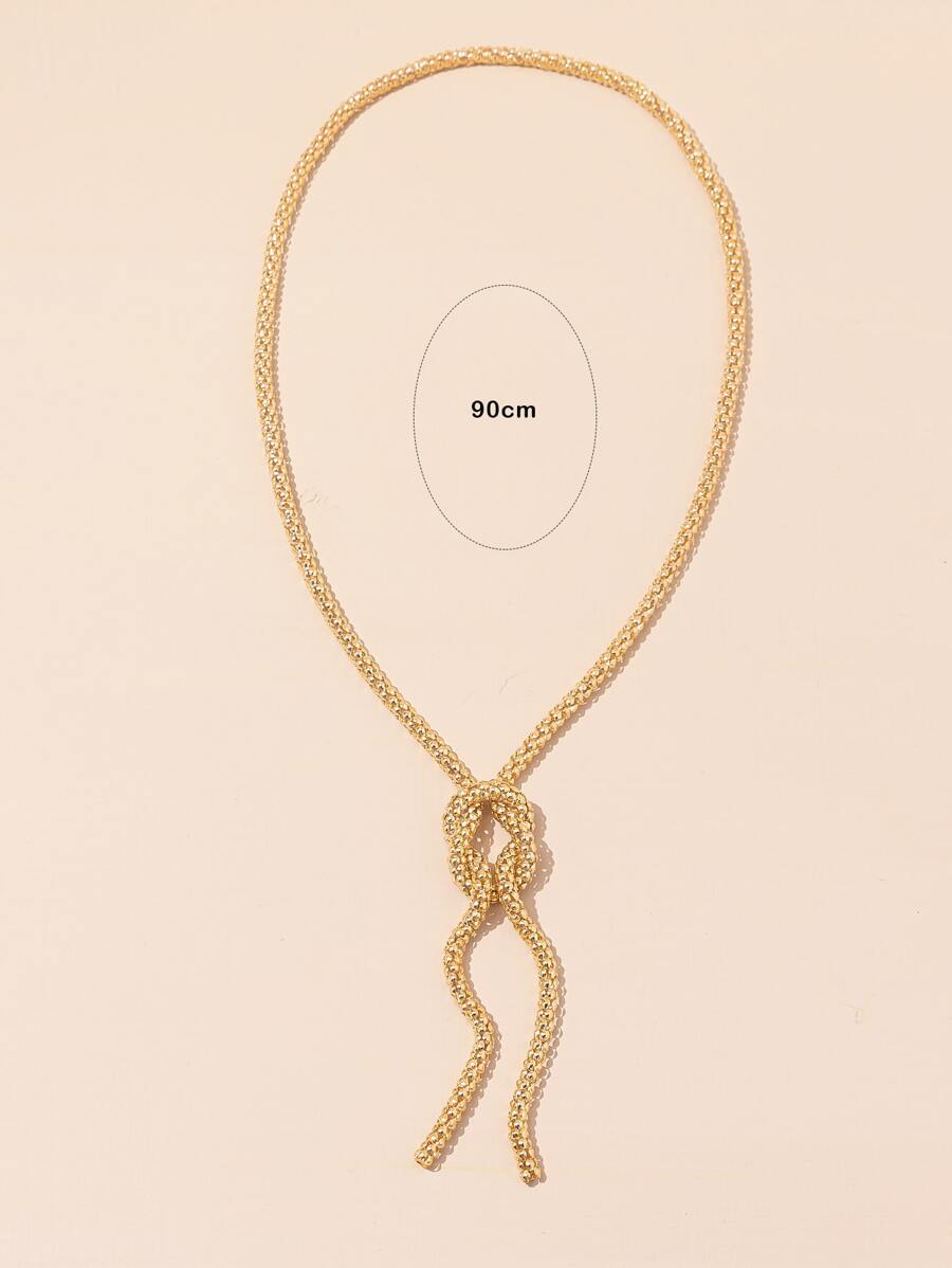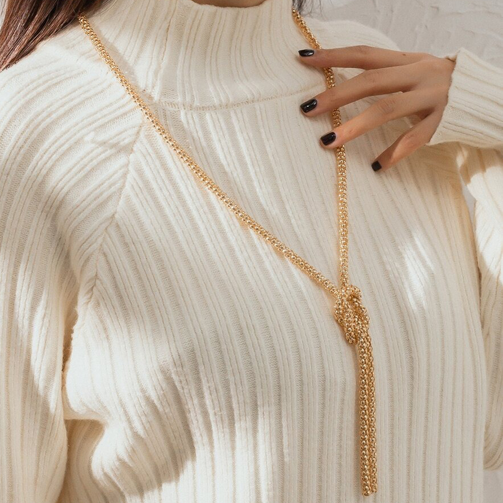 Αποκτήστε το απόλυτο αξεσουάρ με αυτό το μοντέρνο και μακρύ κολιέ-γραβάτα (lariat), ιδανικό για να προσθέσει δυναμισμό και στυλ σε κάθε εμφάνιση. Το κολιέ διαθέτει μια χοντρή αλυσίδα με ανάγλυφη υφή, η οποία σχηματίζει έναν εντυπωσιακό κόμπο στο κέντρο, αφήνοντας δύο κομψά κρεμαστά άκρα να πέφτουν στο ντεκολτέ. Η μεγάλη του διάσταση (περίπου 90cm) το καθιστά ιδανικό για να φορεθεί πάνω από πουλόβερ, ζιβάγκο ή φορέματα με ψηλό λαιμό. Διατίθεται σε λαμπερό χρυσό και κομψό ασημί τόνο. Ένα ευέλικτο statement κόσμημα που δένει αρμονικά το casual με το chic.