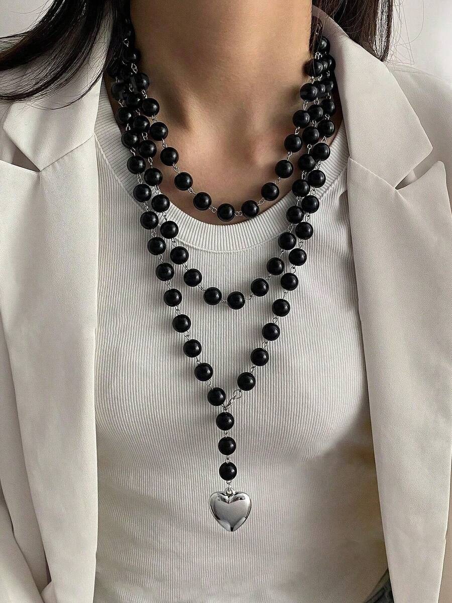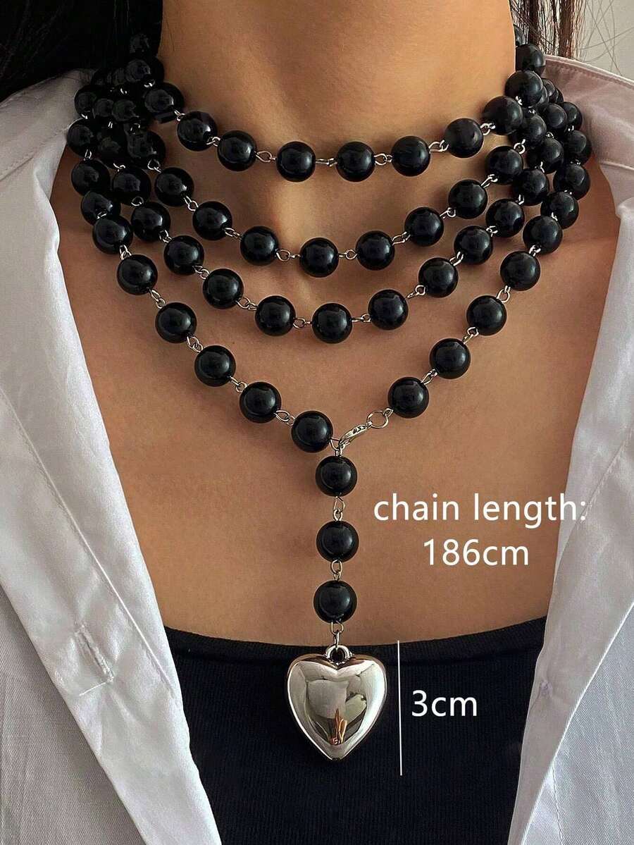 Μακρύ Κολιέ Ροζάριο με Μαύρες Χάντρες και Μεταλλική Καρδιά | Multi-Layer Statement Necklace