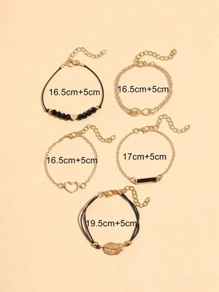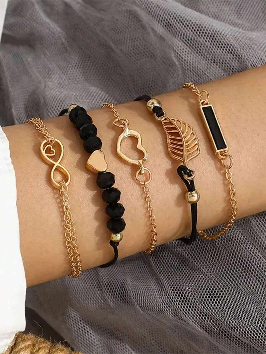 Σετ 5 Boho Βραχιόλια Gold & Black – Καρδιά, Άπειρο & Φύλλο