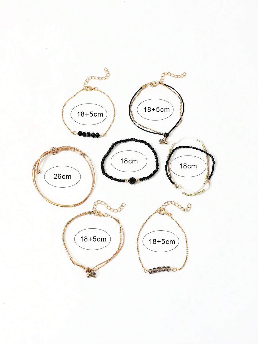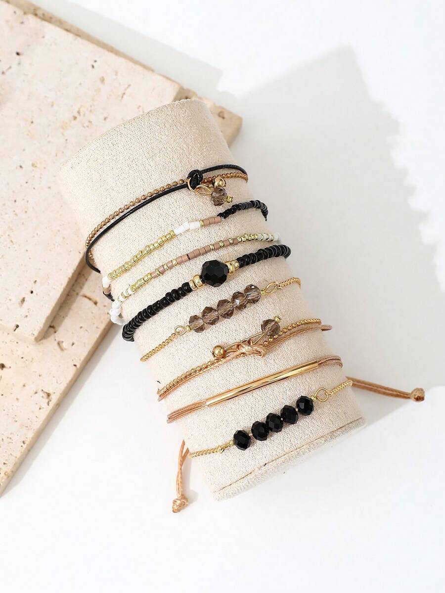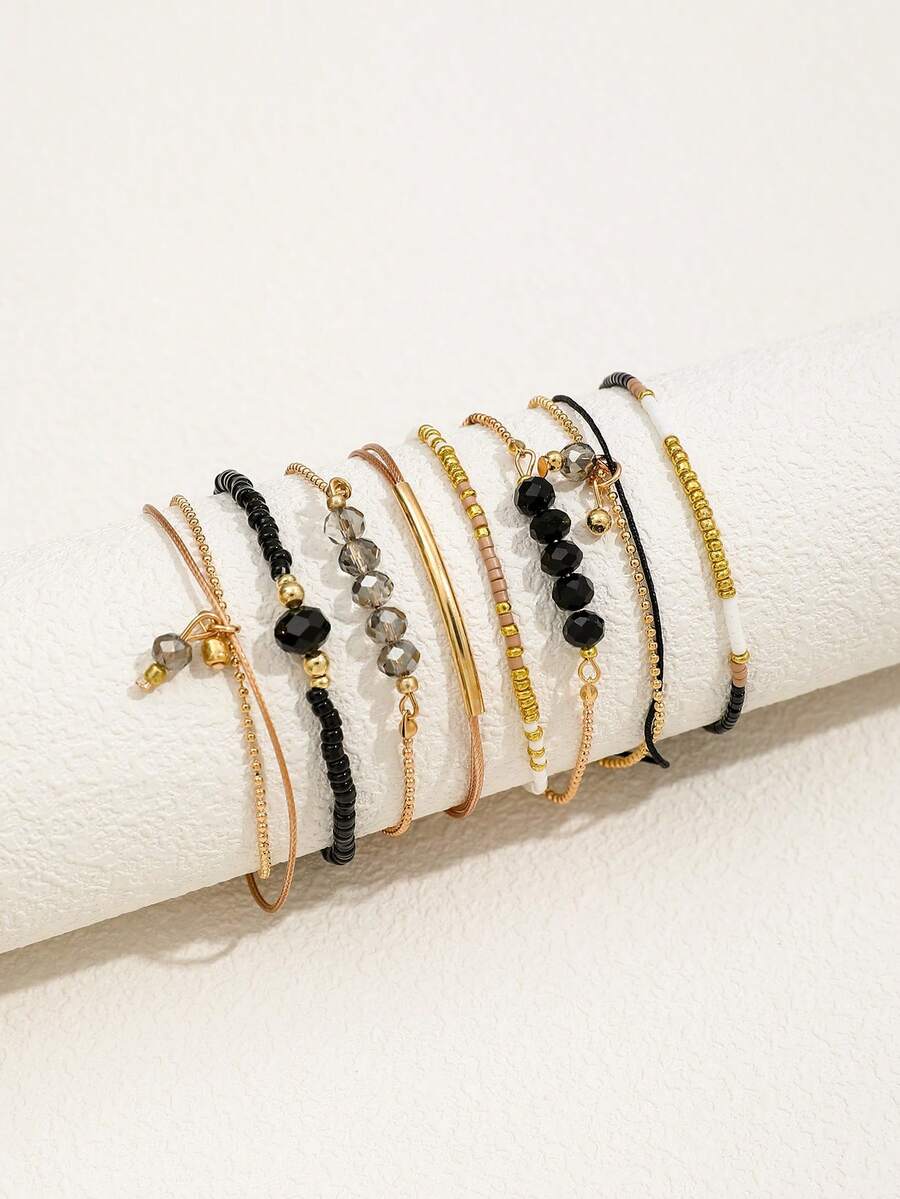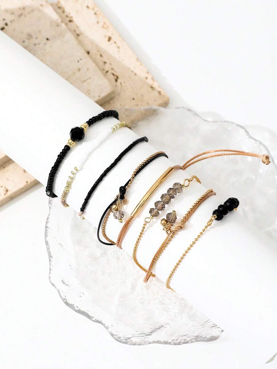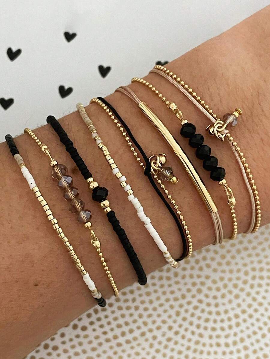 Σετ 7 Γυναικεία Βραχιόλια Boho με Χάντρες, Κρύσταλλα και Χρυσές Λεπτομέρειες – Μαύρο & Μπεζ